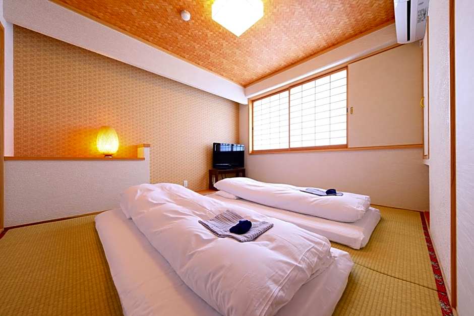 The family room features air conditioning, tatami, as well as a private bathroom boasting a bath and a shower. The unit has 3 futons.